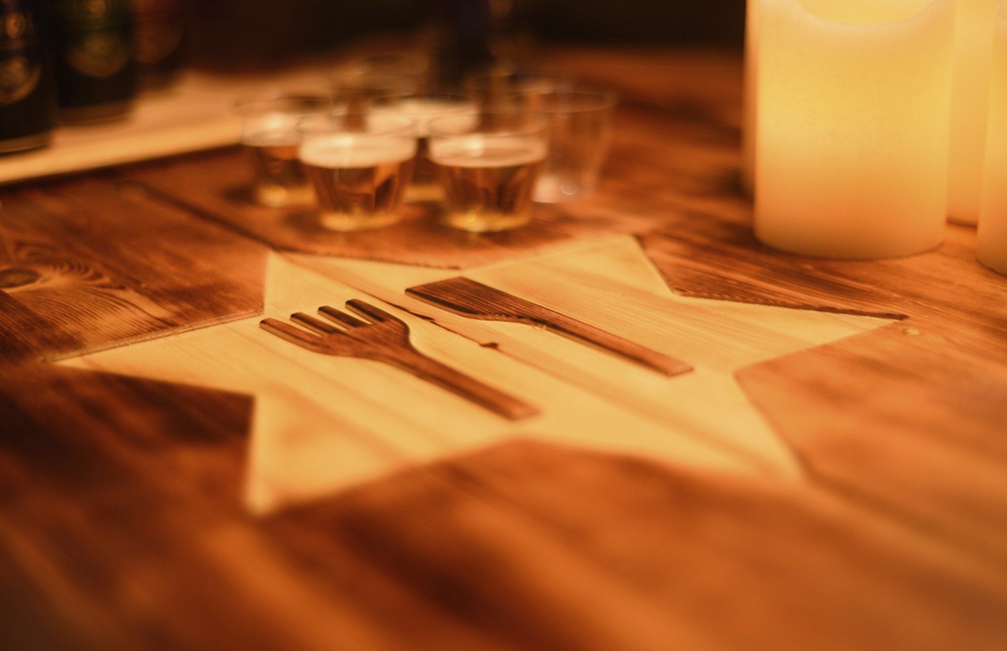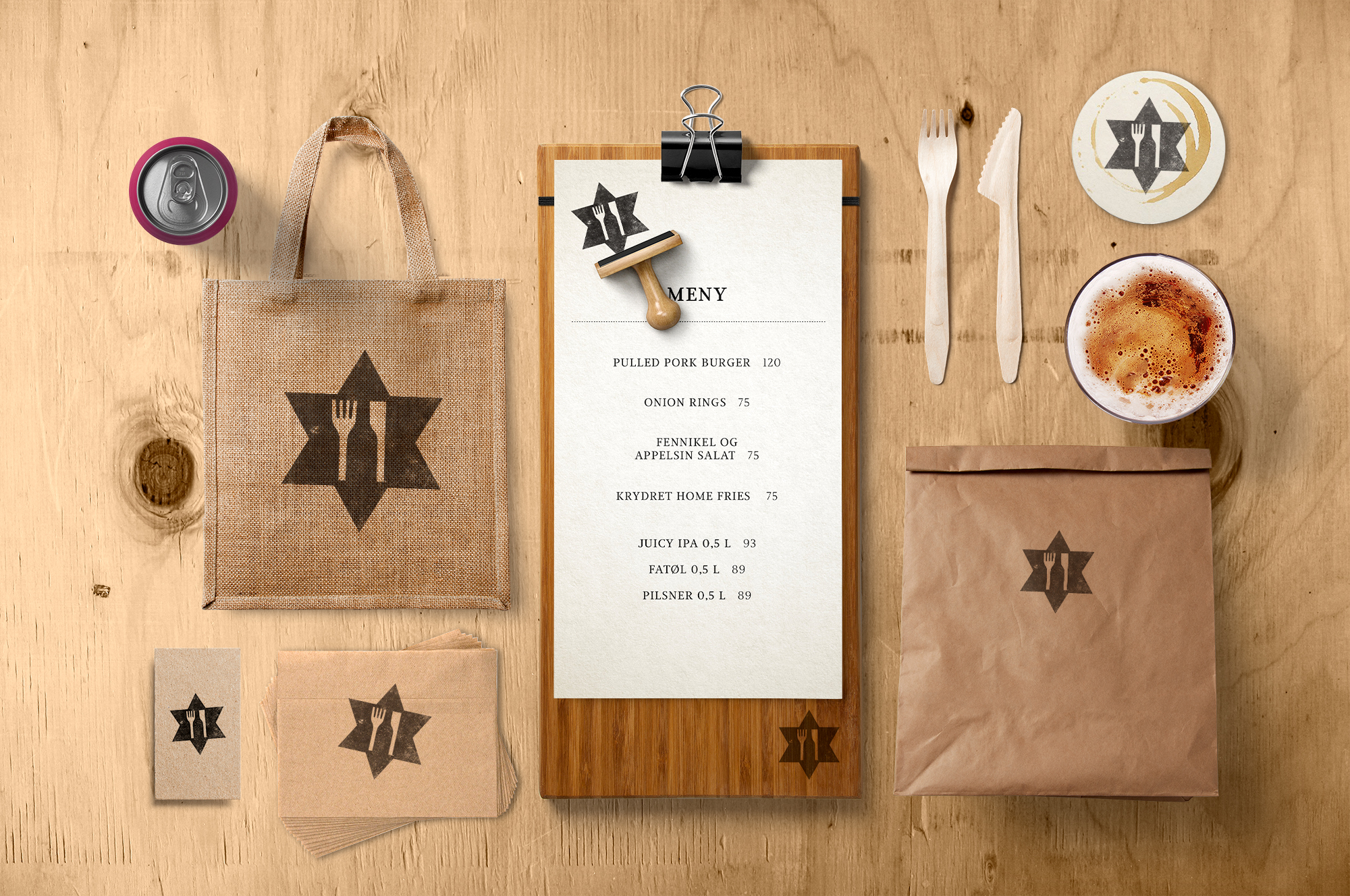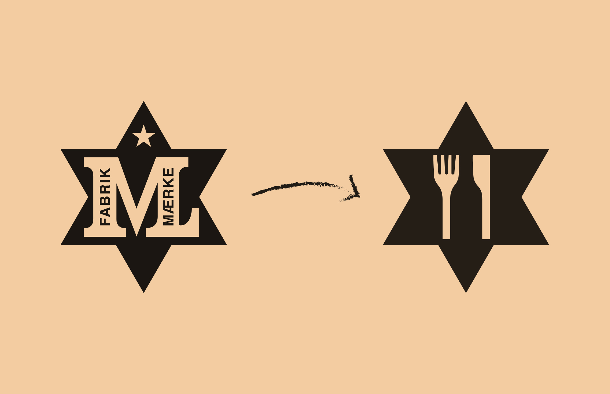The Malt & Pepper logo – a knife and fork creating the shape of a classic Frydenlund beer bottle – was placed inside a stripped down Frydenlund“ML Star” as a cheeky nod to the mother brand.