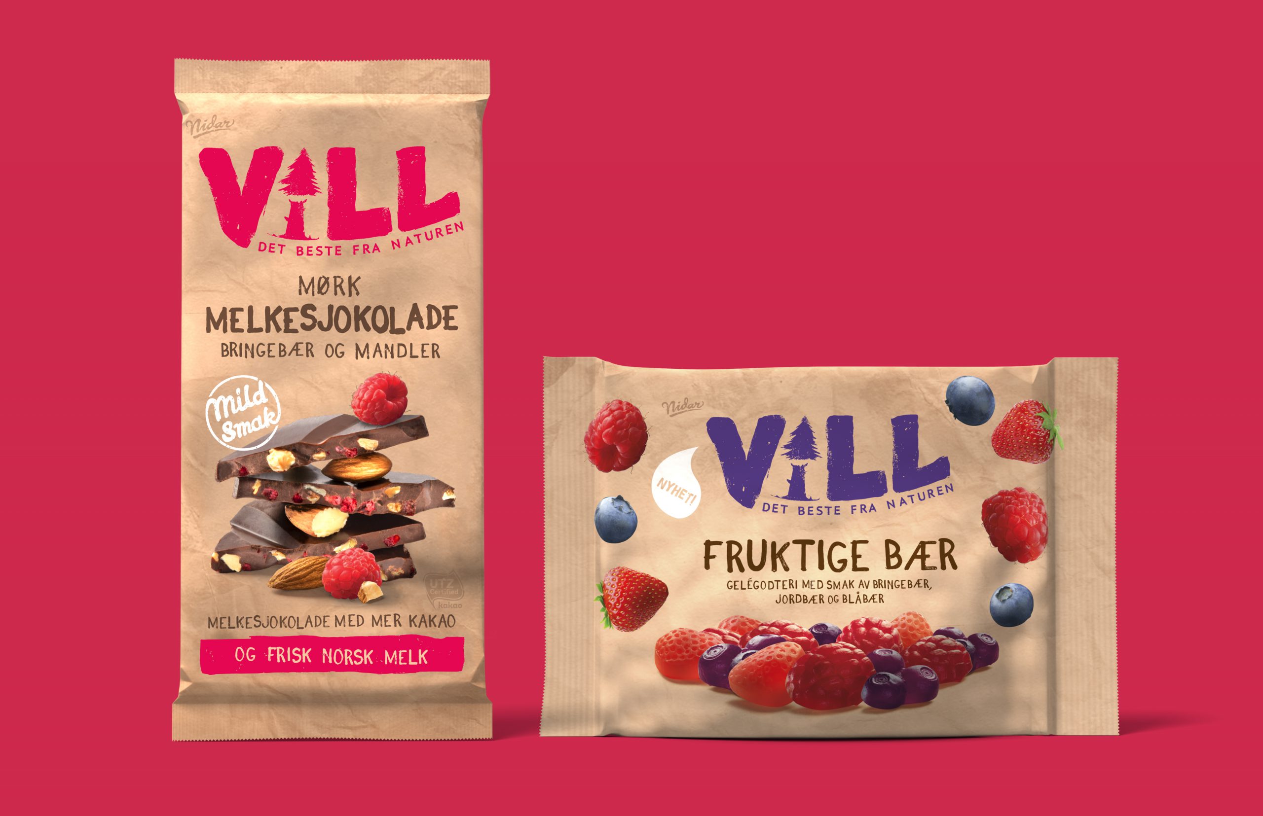 Pure cacao, fresh milk, less sugar, real fruit juices and short ingredient lists are the core of Nidar´s refreshingly new candy series, Vill (meaning Wild). Simply good stuff – straight from nature.